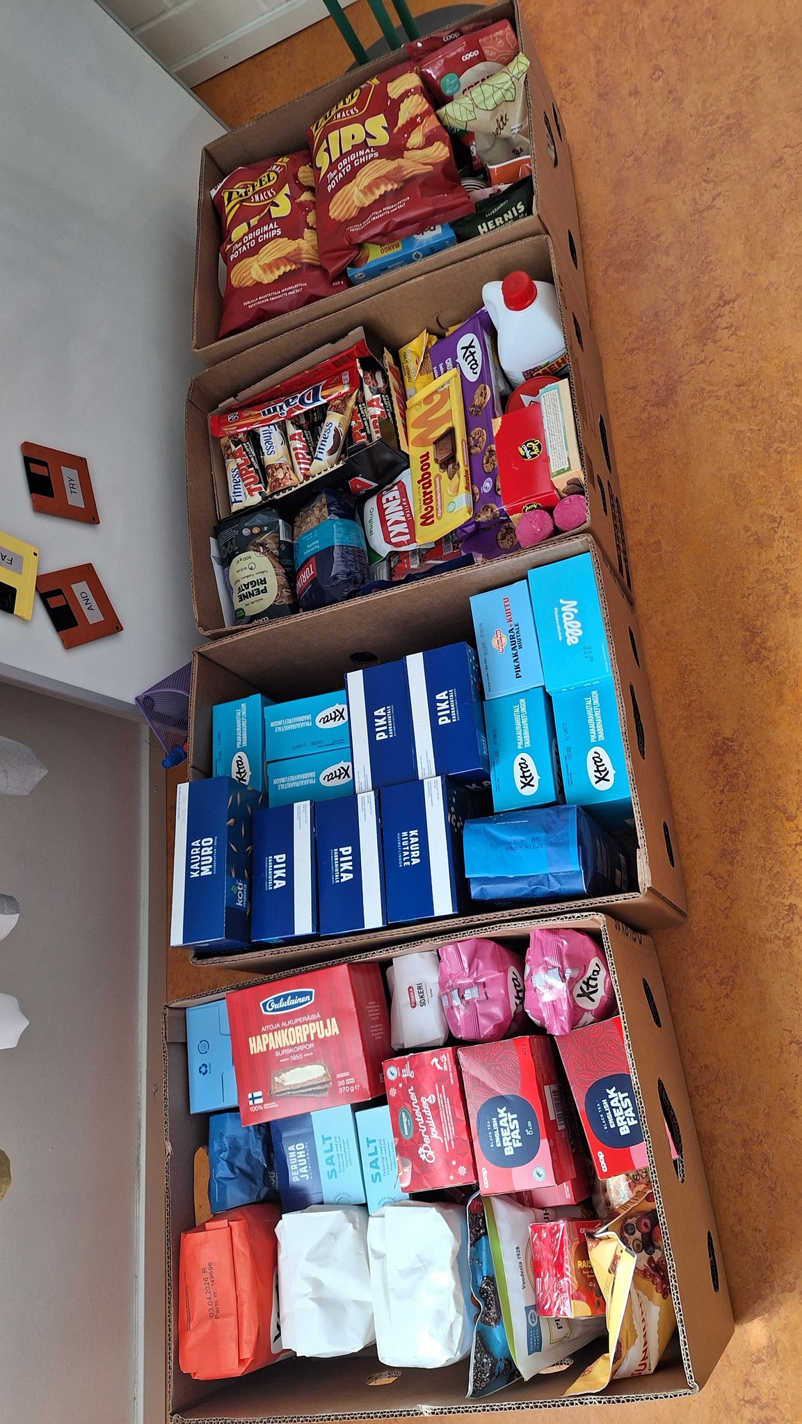 Pakkasimme kerätyt tuotteet lajiteltuina Prismasta saatuihin banaanilaatikoihin, sitten täydet ja painavat laatikot kärryillä autoihin, jotka tulivatkin täpötäyteen ja ajoimme saattueena kohti Moisiossa sijaitsevaa seurakuntataloa.